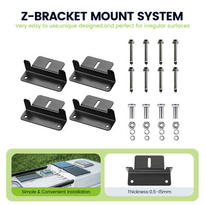 किट में शामिल फिक्स्ड माउंटिंग विकल्पों के साथ स्थापना सरल है।इन माउंटिंग समाधानों को सुरक्षित रूप से अपने RV की छत या किसी अन्य उपयुक्त सतह के लिए सौर पैनल संलग्न करने के लिए डिज़ाइन किया गया है, अधिकतम सूर्य के संपर्क और अधिकतम ऊर्जा अवशोषण सुनिश्चित करता है। फिक्स्ड माउंट विकल्प भी यात्रा के दौरान स्थिरता और सुरक्षा प्रदान करते हैं,गति या कंपन के कारण सौर पैनल को होने वाले किसी भी नुकसान को रोकनायह सुविधा उन लोगों के लिए विशेष रूप से मूल्यवान है जो अक्सर सड़क पर जाते हैं और एक टिकाऊ, लंबे समय तक चलने वाली सौर प्रणाली चाहते हैं जो यात्रा की कठोरता का सामना कर सकती है।