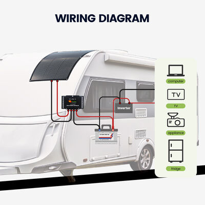 सिस्टम का आउटपुट वोल्टेज 12V DC है, जो अधिकांश RV बैटरी सेटअप के साथ पूरी तरह से संरेखित होता है, जो आपके मौजूदा विद्युत सिस्टम में संगतता और सीधी एकीकरण सुनिश्चित करता है। यह वोल्टेज आउटपुट आपकी आरवी बैटरी को कुशलता से चार्ज करने, रोशनी, उपकरणों और अन्य 12V उपकरणों को बिजली देने के लिए आदर्श है जो आमतौर पर मनोरंजक वाहनों में उपयोग किए जाते हैं।